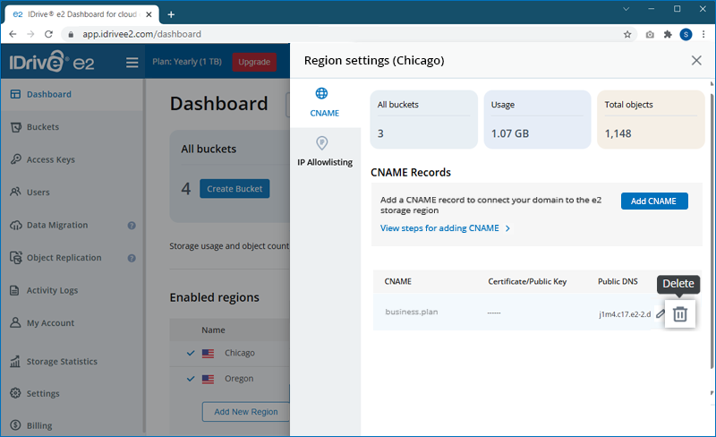 Yes, you can replace IDrive® e2 specific region domain names with your own domain names. You need to create a CNAME record for your domain name server and point that to your e2 region domain name. The Dashboard on the web console lists the IDrive® e2 specific domain names of each enabled region.