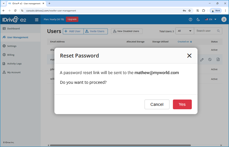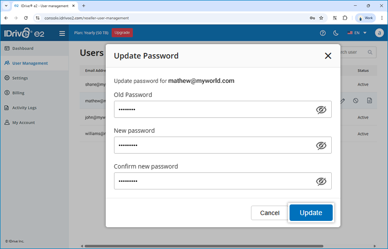 The user will receive a link in email to create IDrive® e2 account. All users will be listed under the 'User Management' tab.