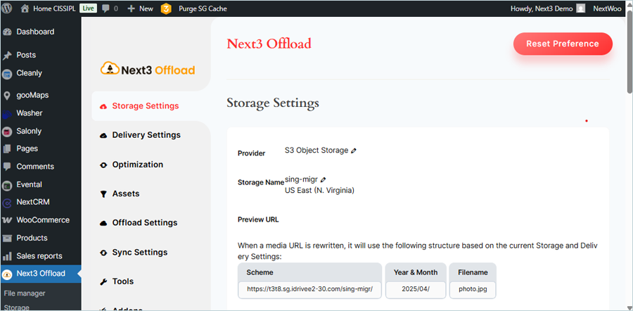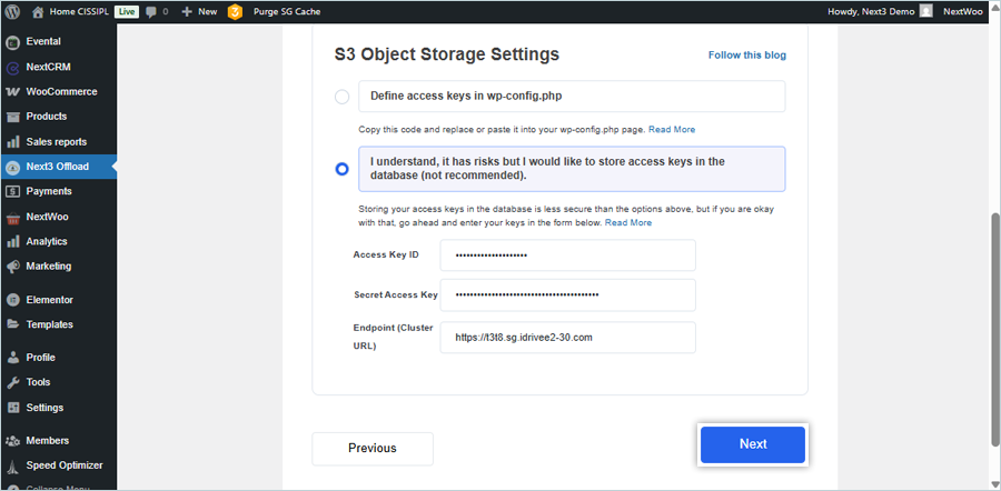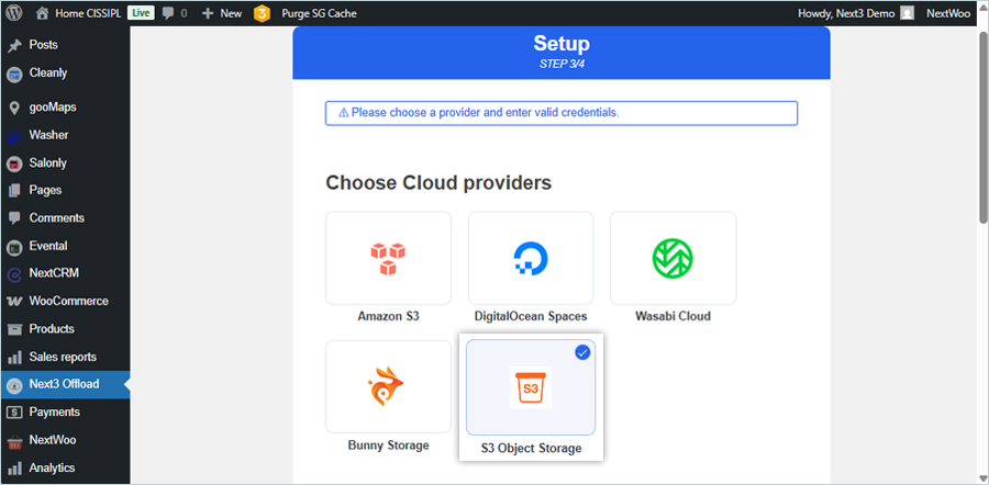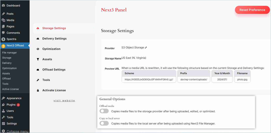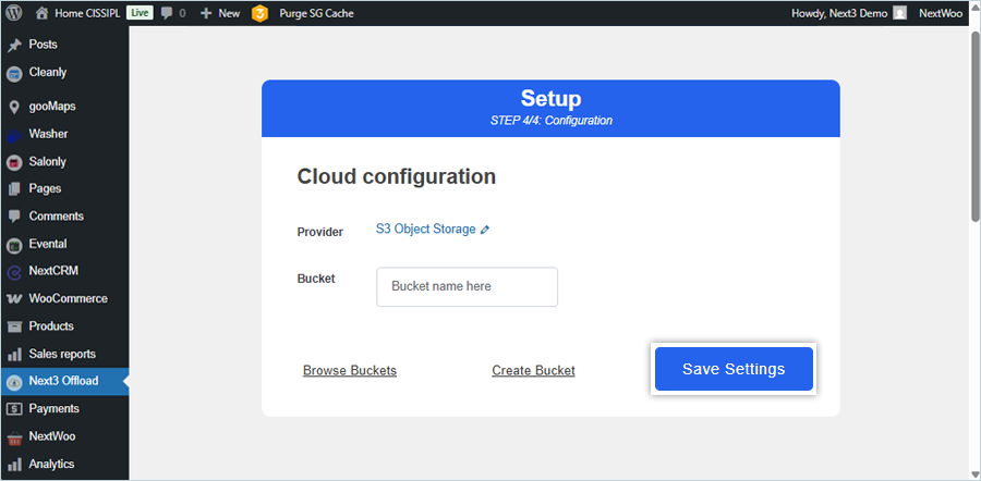 - In the WordPress dashboard, go to Next3 Offload > Storage Settings.