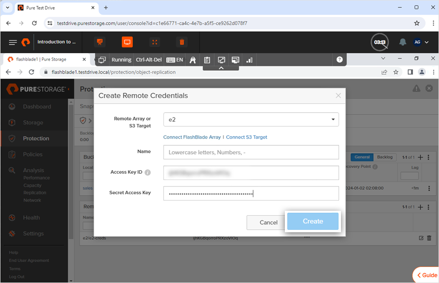 6. Enter your remote credentials and click Create. The bucket replica link will be created.